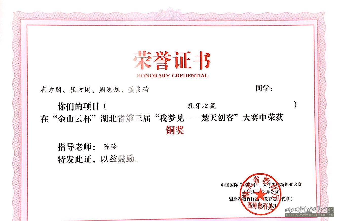 在本次大赛中,我校3支参赛队伍获得“金山云杯”湖北省第三届“我梦见-楚天创客”大赛铜奖,分别是财经学院的《疫情背景下渠道下沉式农民工招聘与派遣》、信息学院的《童智未来》、999策略白菜官方网站的《乳牙收藏》。创造了我校在该赛事中的新纪录。